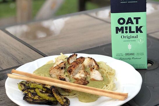 What's not to love about pesto. We love it with just about everything. pesto to the oat milk cream sauce creates a rich, flavorful combination, quick to become your favorite, easy pasta recipe! Plus, pesto packs healthy punch of good for you, unsaturated fats. The olive oil, nuts, and basil in pesto also provide vitamins, minerals, and antioxidants.