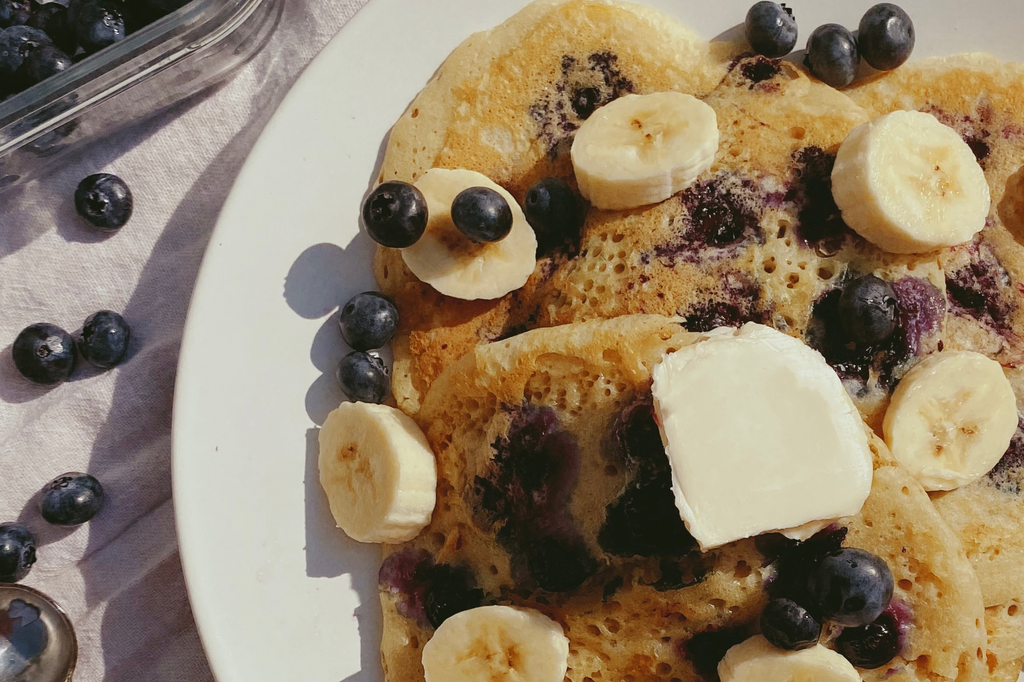 Because sourdough starter is a fermented food, using it for pancakes creates a unique, slightly tangy flavor just like sourdough bread has. This makes them a great way to switch up your typical weekend breakfast and try something new. Sourdough pancakes are not quite as sweet as normal pancakes, which makes them a great base for adding maple syrup and all your usual favorite toppings. We added blueberries and bananas to ours. Dark chocolate chips, apple slices, and peanut butter would also pair perfectly with these pancakes.
