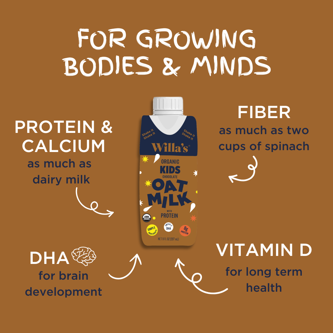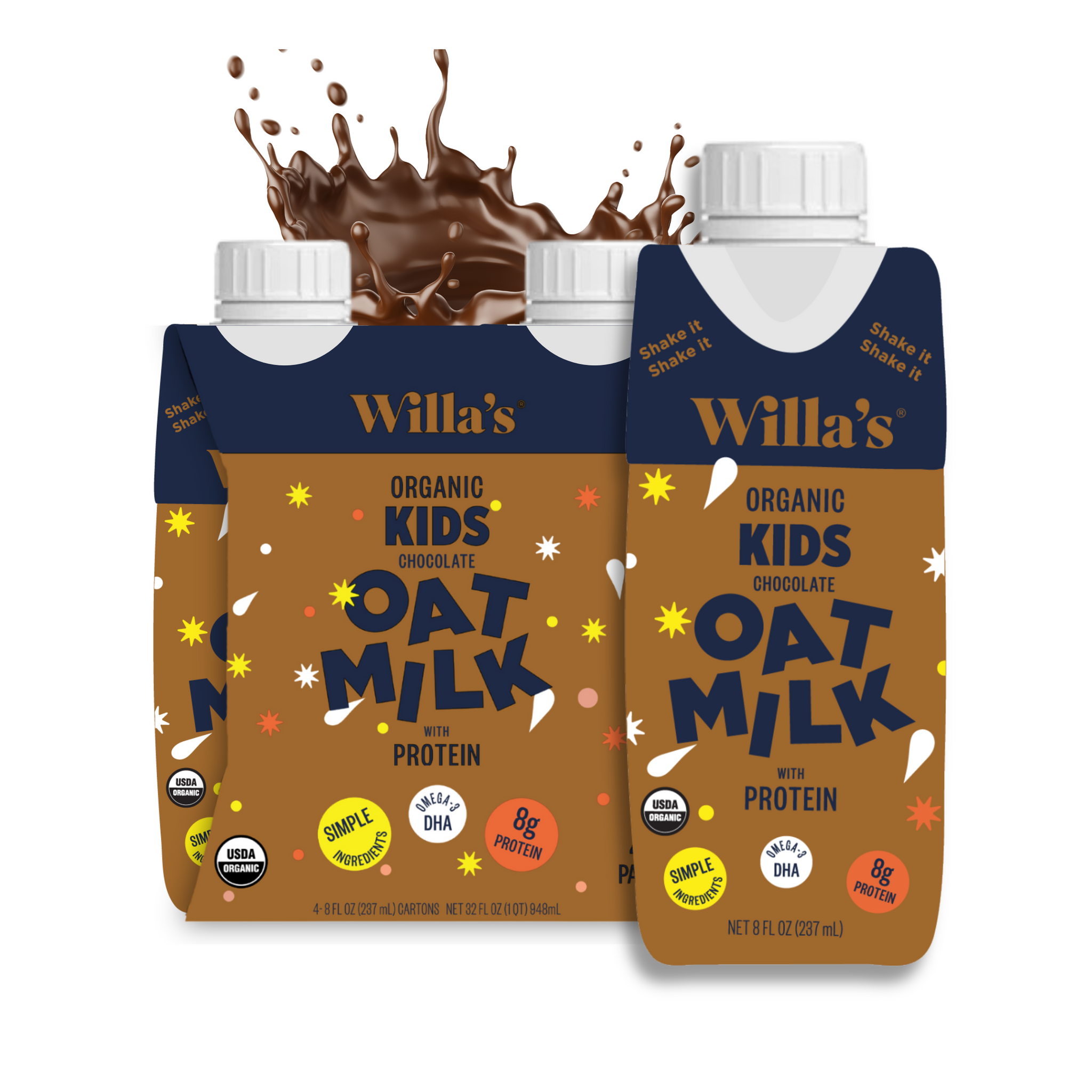 Finally, plant-based milk kids love and parents trust! Willa’s Organic Kids Chocolate Oat Milk is made with simple organic ingredients and packed with nutrients for growing bodies and minds.